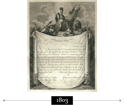Following the Battle of the Nile and the destruction of Napoleon’s fleet, the Lloyd’s Committee raised £38,000 to help the wounded and bereaved, and donated a silver dinner service to Nelson as ‘a small token of their gratitude.’ To mark the first anniversary of the Battle of the Nile, Sultan Selim III honoured Admiral Nelson with The Order of the Crescent. These and other artifacts can be seen in Lloyd’s Nelson Collection, some of which is on display on the History Floor at the Lloyd’s building in London.
