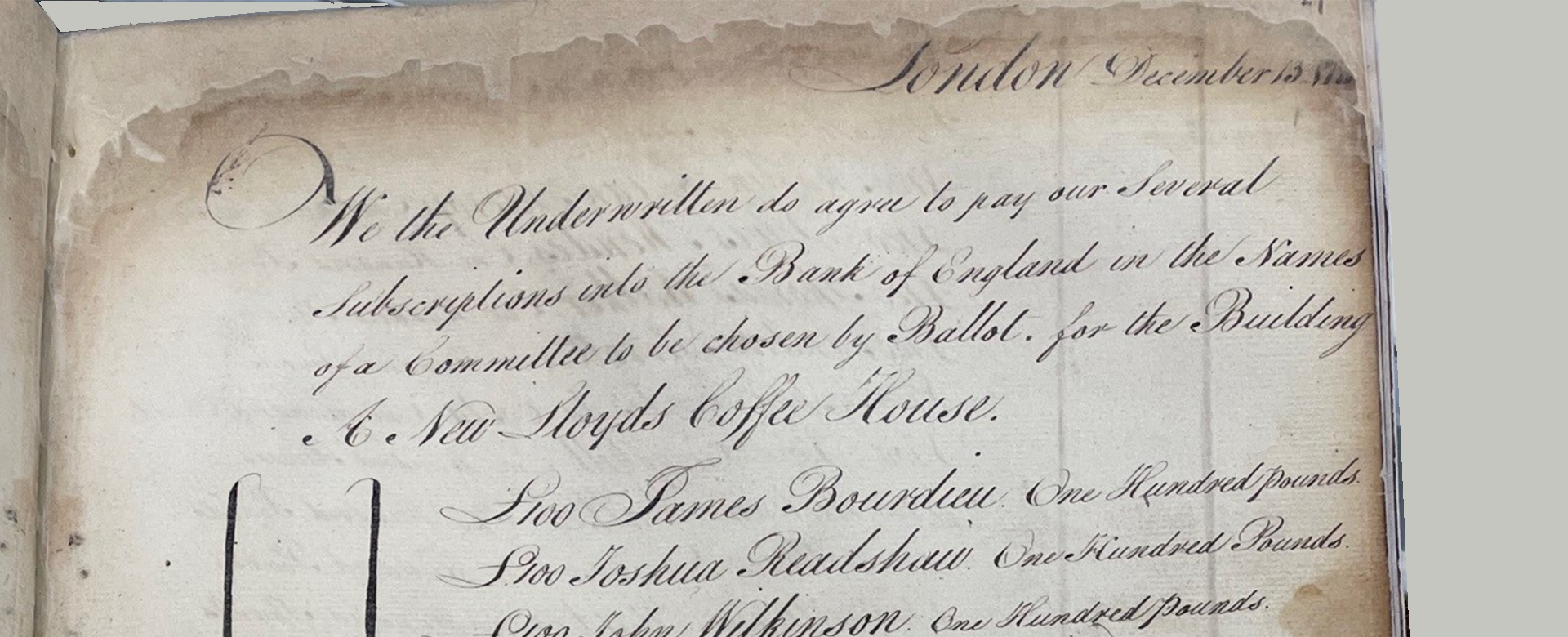 In 1769 a group of merchants, brokers and underwriters moved their business from Lloyd’s Coffee House in Lombard Street to ‘New’ Lloyd’s Coffee House at 5 Pope’s Head Alley. This was to distinguish themselves from the ‘shameful practices … such as Speculative Insurances on the Lives of Persons and Government Securities… it is notorious they are calculated for the purposes of Stock-jobbing, and tend to weaken Public Credit.’[1] On 13 December 1771, 77 of these men subscribed £100 each for the ‘Building of A New Lloyd’s Coffee House’. The original list of founders forms the first entry of the Minute Books, and is part of a series of records that continues through to today.