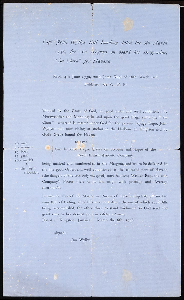This conversation takes as its starting point a Bill of Lading for 100 enslaved people. These printed forms record the receipt of goods transported by sea. This document was gifted to Lloyd’s in 1941.