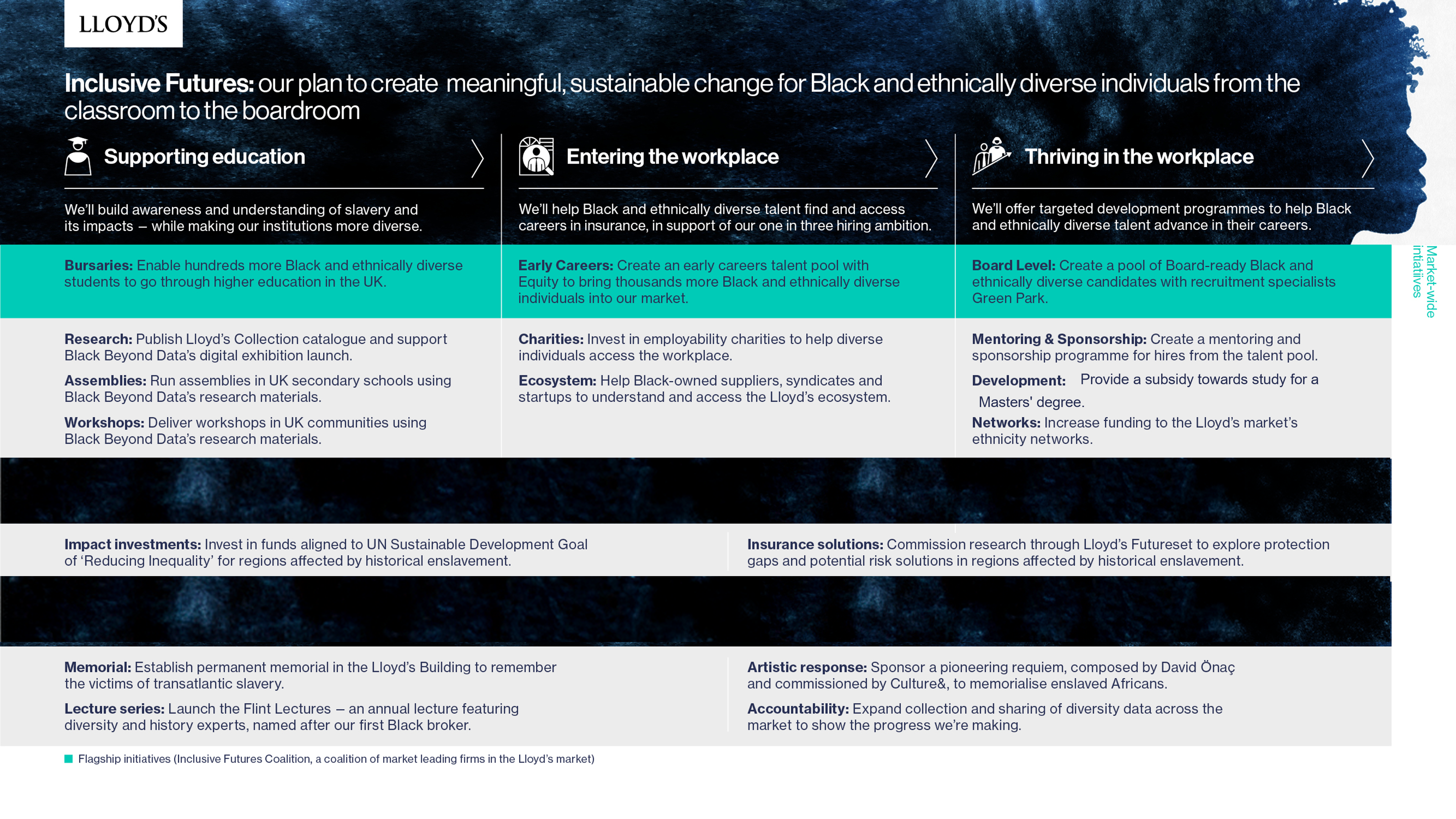 The programme has been shaped in consultation with Black experts and ethnically diverse colleagues from across the Lloyd’s market to deliver meaningful, lasting change towards a more inclusive marketplace and society. It includes important interventions from our hiring and development to our investments and charitable giving, spanning the next decade and beyond.