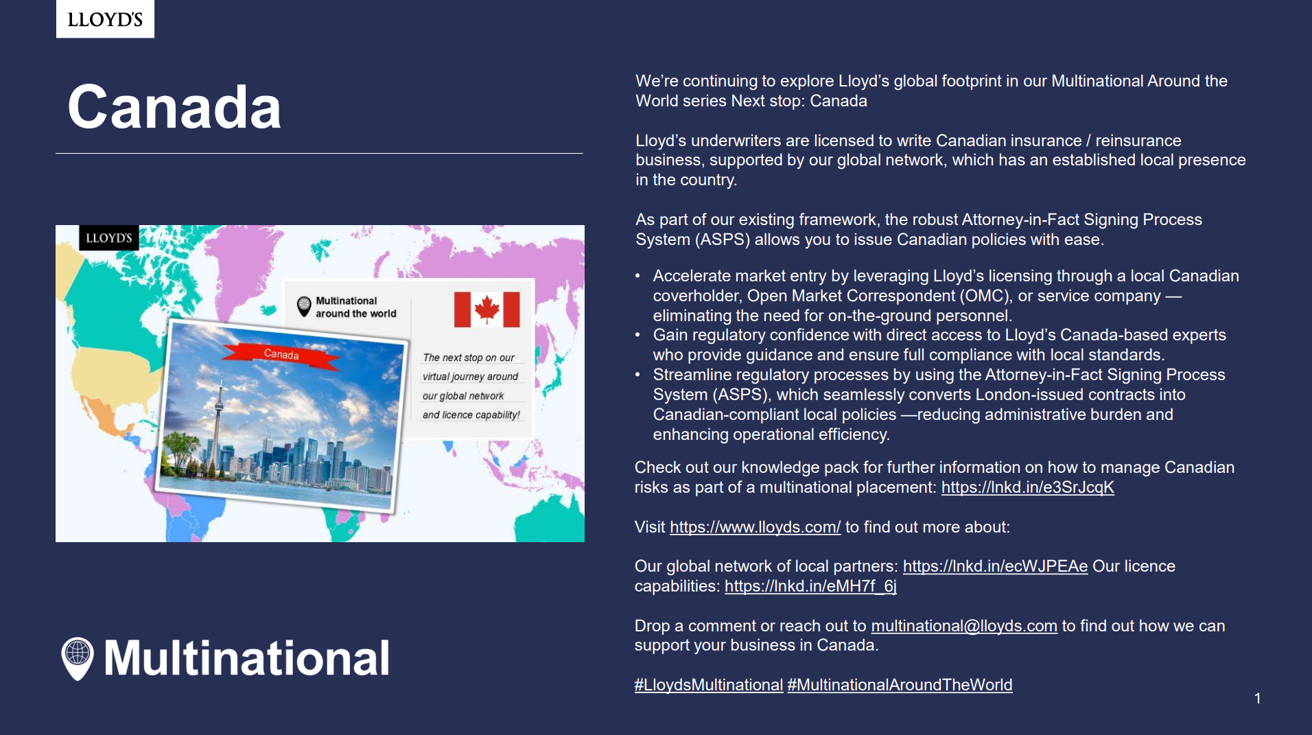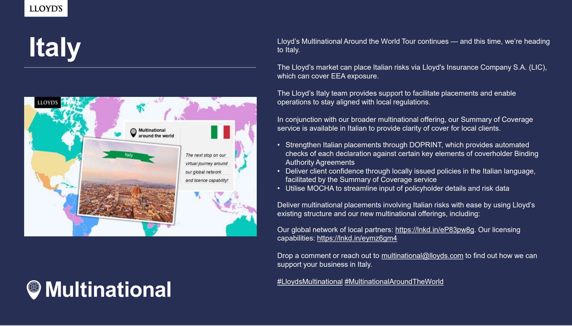Lloyd’s new Multinational Knowledge Hub is an invaluable resource designed to support professionals in the global insurance industry. It offers a wide range of information and tools to help users navigate the complexities of managing multinational insurance programmes. Whether you’re looking to expand your knowledge about multinational at Lloyd's or need specific guidance on managing risk locations, this library is an essential tool for anyone involved in multinational insurance.